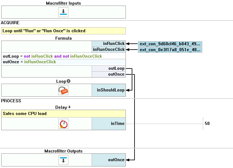 Go to the LoopPause macrofilter. Connect the formula inputs to the Value outputs of the Run and the Run Once HMI buttons.