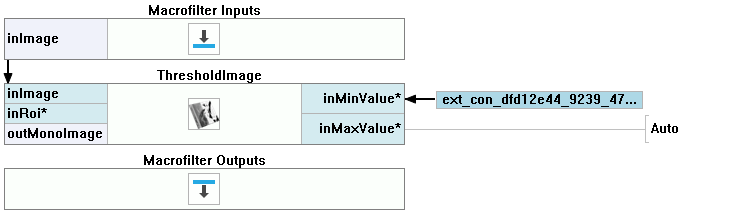 Inside the ProcessImage macrofilter, add the ThresholdImage filter. Connect its inImage to the step input.