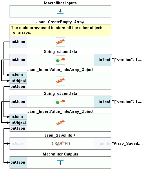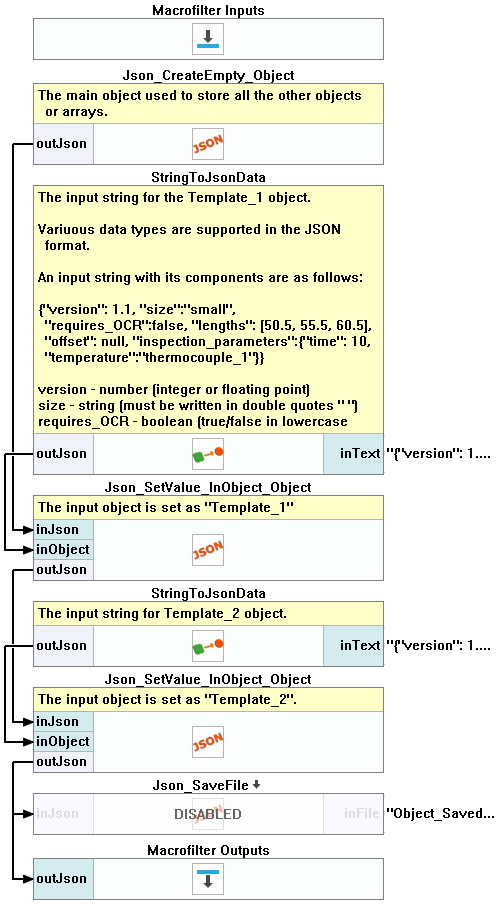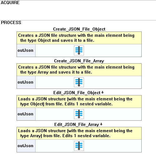The aim of the application is to show the capabilities of the JSON file handling tools. Two cases are presented: in the former, the main element is the type Object, whereas in the latter, the main object is the type Array.
