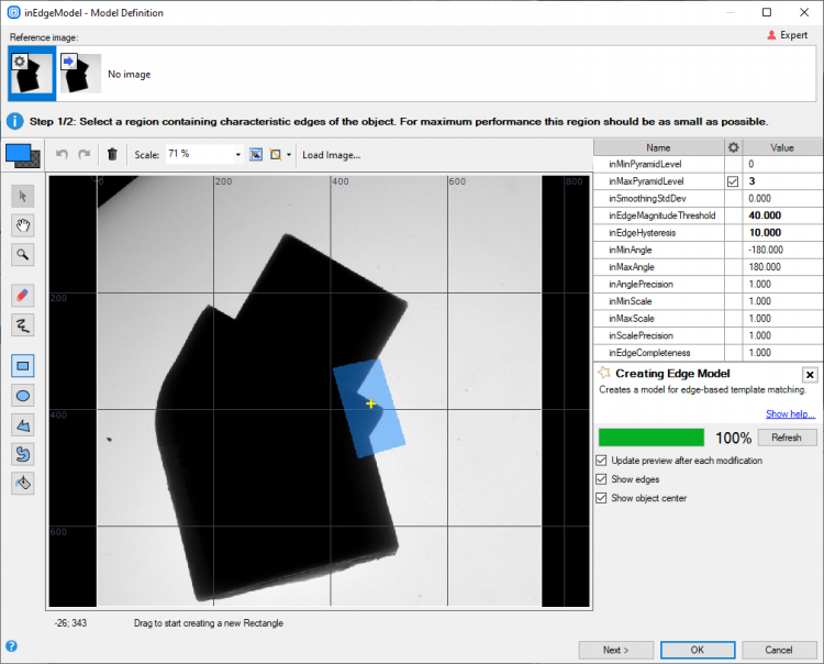 In the first step, the object has to be located. We recommend the LocateSingleObject_Edges1 filter for this purpose. Next, the interesting contours of the objects have to be detected with Shape Fitting filters such as the FitSegmentToEdges.