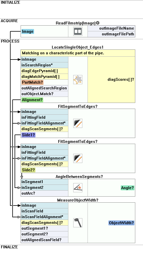 Next, a location of the pipe should be found. To perform this task, add the LocateSingleObject_Edges1 filter. Next, connect output image from the ReadFilmstrip.