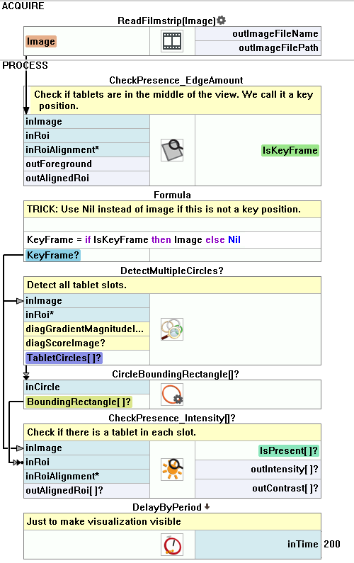 To detect damaged tablets, it is recommended to consider using the DetectMultipleCircles filter together with the CheckPresence_Intensity filter to verify object presence by analyzing pixel intensities. To ensure that the inspection is performed once for each batch of tablets, you can specify a Region Of Interest, where the inspection should be performed, as an input of the CheckPresence_EdgeAmount filter.