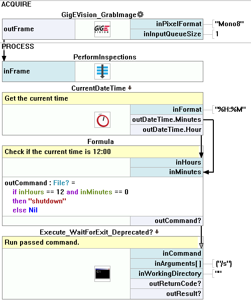 Example below shows how to shut down computer at desired time using Execute_WaitForExit_Deprecated filter.