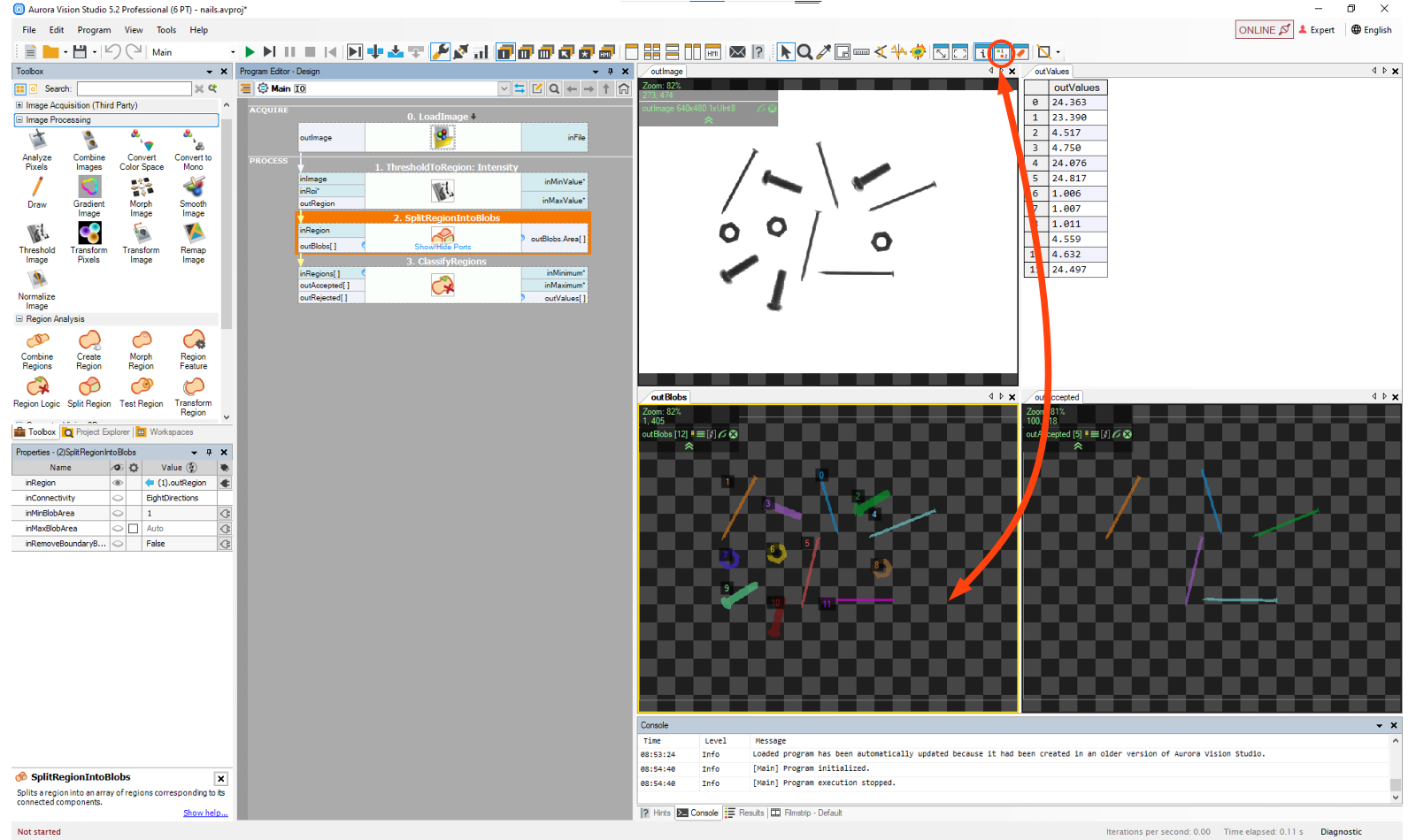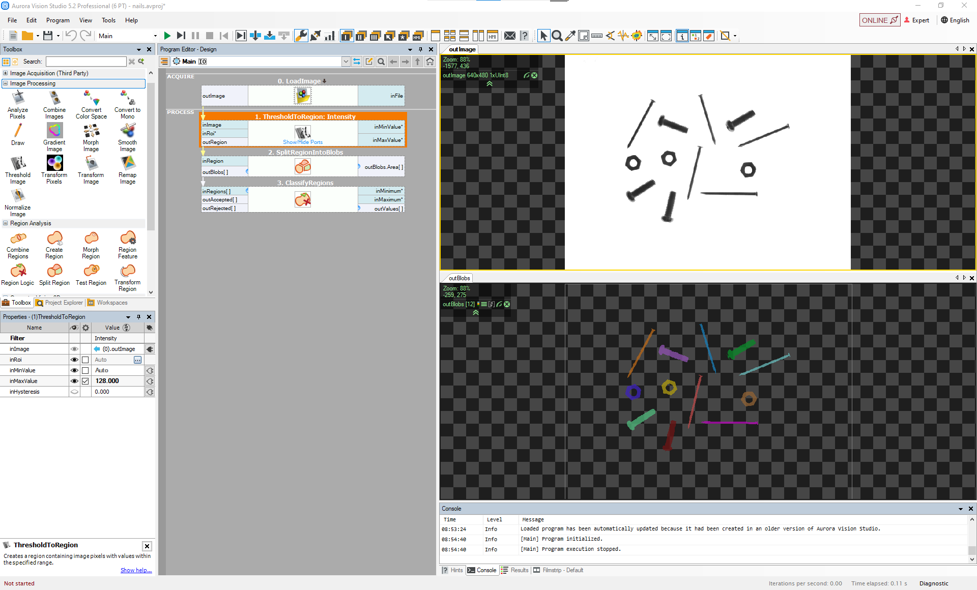 This article demonstrates the basic workflow in Aurora Vision Studio with an example of simple blob analysis. The task here is to separate nails from other objects which are present in the input image.