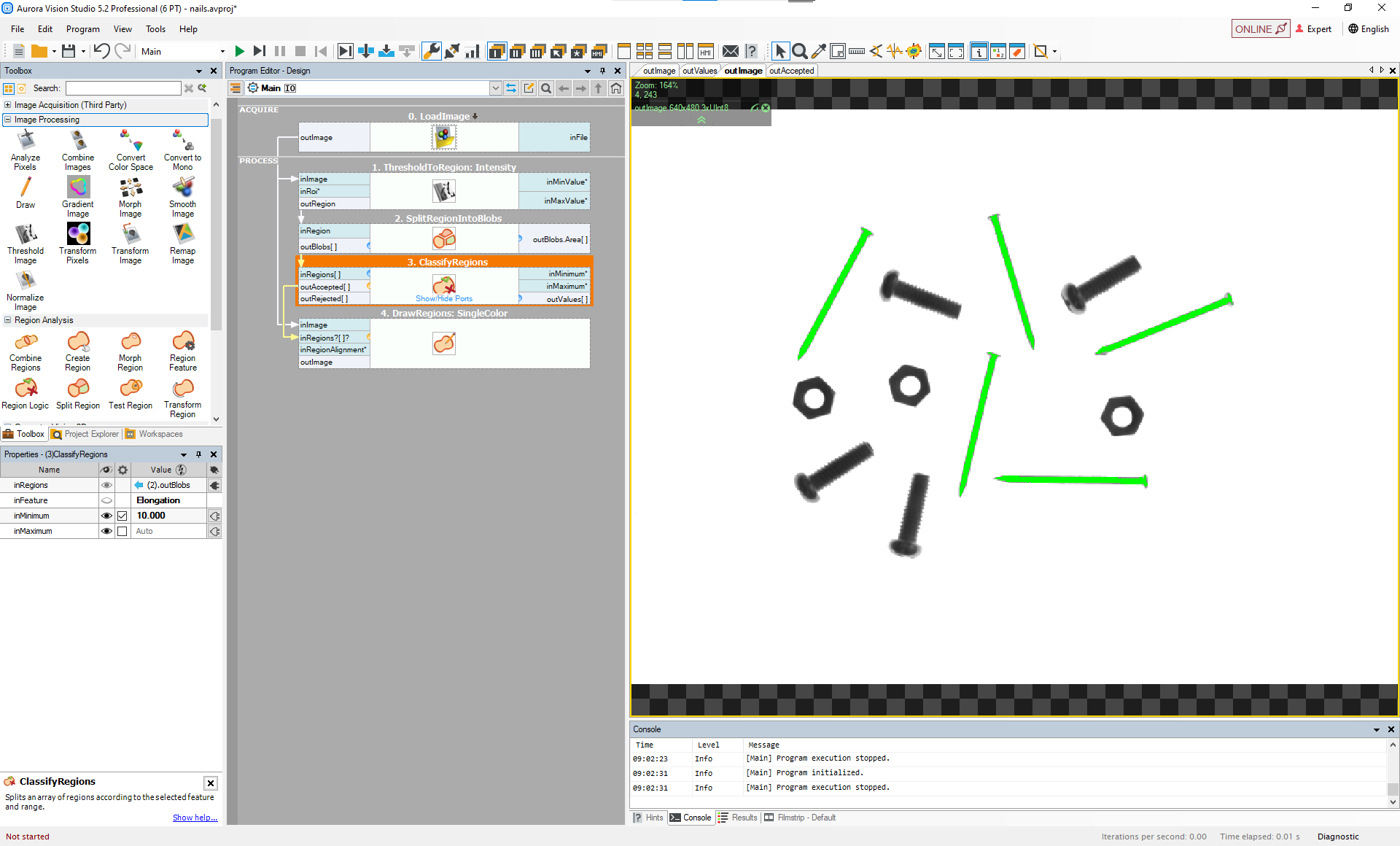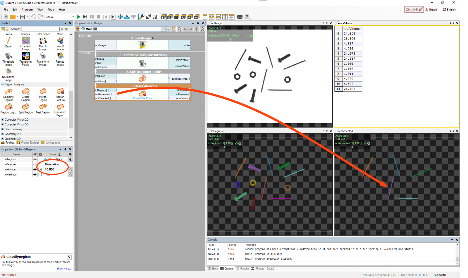 At this stage what we have is an array of regions. This array has 12 elements, of which 4 are nails. To separate the nails from other objects, we can use the fact that they are longer and thinner. The ClassifyRegions filter (Region Analysis → Region Logic) with inFeature input set to Elongation and inMinimum set to 10 will return only the nails on its outAccepted output:
