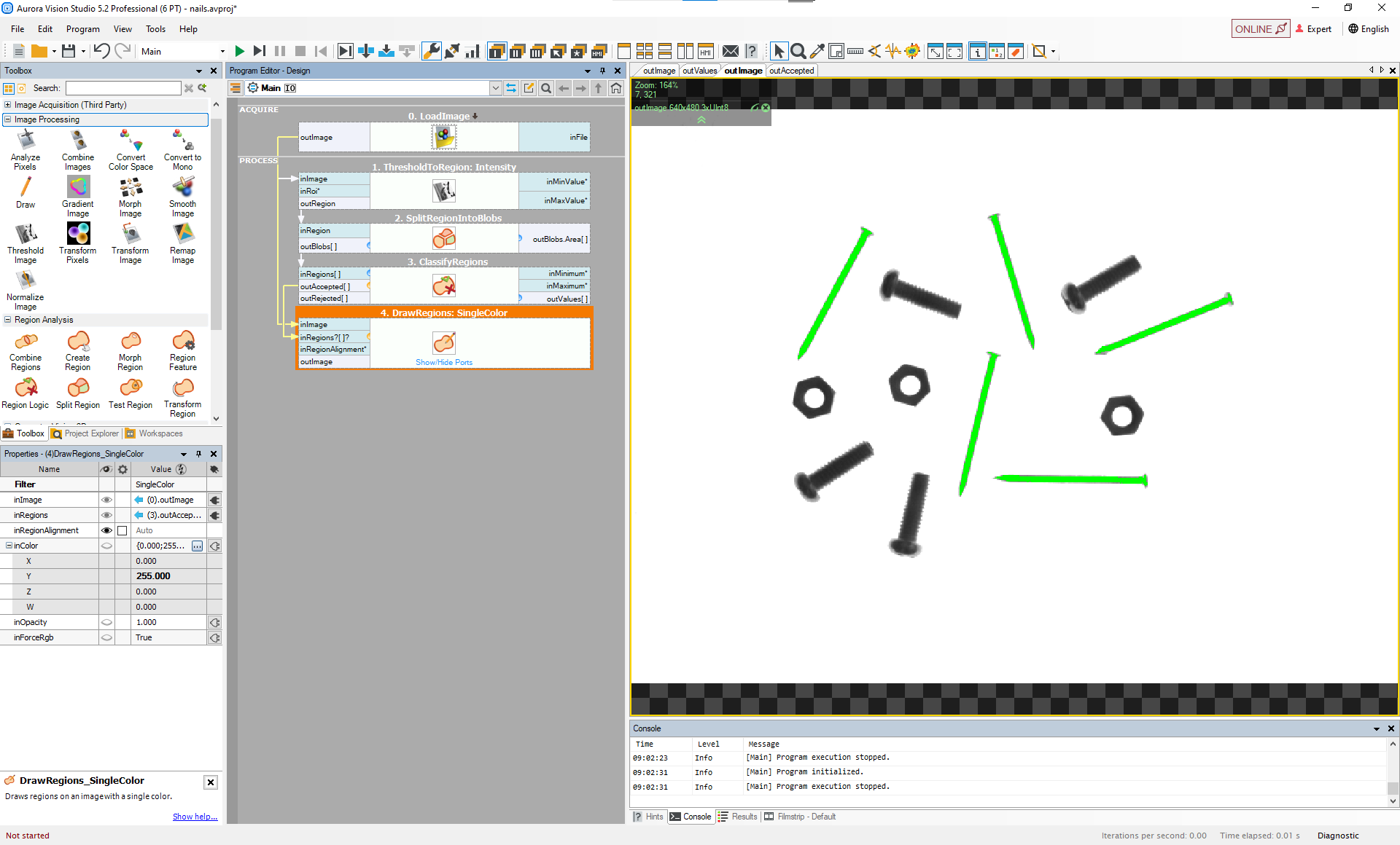Finally, we can create an output image (e.g. for displaying in the HMI) with the nails marked in green. For this purpose we use the DrawRegions_SingleColor filter, which needs to have its inImage and inRegions inputs appropriately connected. The inColor input defines the required color and can be edited through the Properties window.