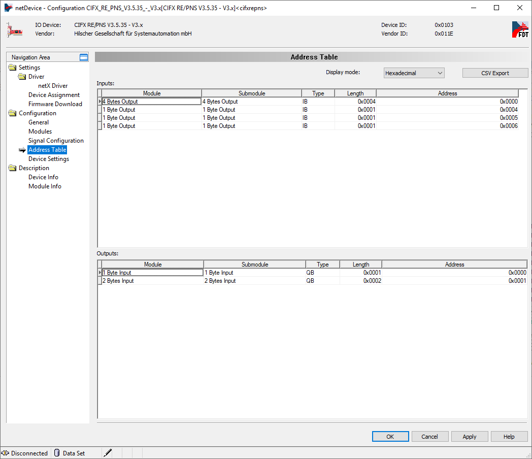 You can see the final address table (addresses on the Hilscher device where input or output data will be available) in the "Configuration/Address table" category. If you plan to use IORead and IOWrite filters, for example Hilscher_Channel_IORead_SInt8, note the addresses. You can switch the display mode to decimal, as Aurora Vision Studio accepts decimal addressing, not hexadecimal. Aurora Vision Studio implementation of Profinet checks whether the address and data size match. In the sample configuration below, writing a byte to address 0x002 would not work, because that module address starts at 0x001 and spans 2 bytes. Moreover, Aurora Vision Studio prohibits writing with a SlotWrite filter to input areas, and reading with a SlotRead filter from output areas. Click "OK" when you have finished the proper configuration.