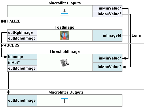 We have to have some Aurora Vision Studio project, which macrofilter we want to use in our application. For demonstrative purposes the project will be as simple as possible, just thresholding Lena's image with parameters provided in a Visual C# application's GUI. The macrofilter we would like to run in a C# application will be ThresholdLena (see: Creating Macrofilters). The whole macrofilter consists of two filters as in the image below:
