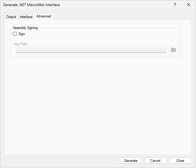 - Enables signing the generated Macrofilter .NET Assembly with given private key and makes it a assembly. Keys may be generated e.g. in Strong Name Tool or in Microsoft Visual Studio IDE (C# project properties page).