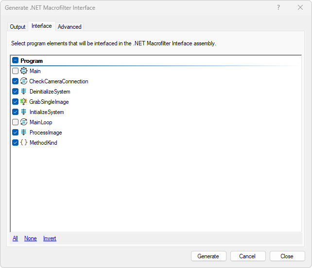 Having a ready Aurora Vision Studio project, a .NET Macrofilter Interface assembly may be generated from File » Generate .NET Macrofilter Interface.... If the project has not been saved yet, you will be prompted to do it now.