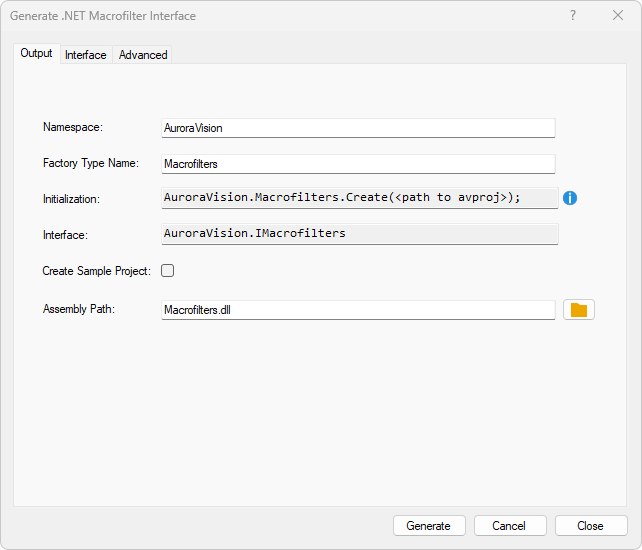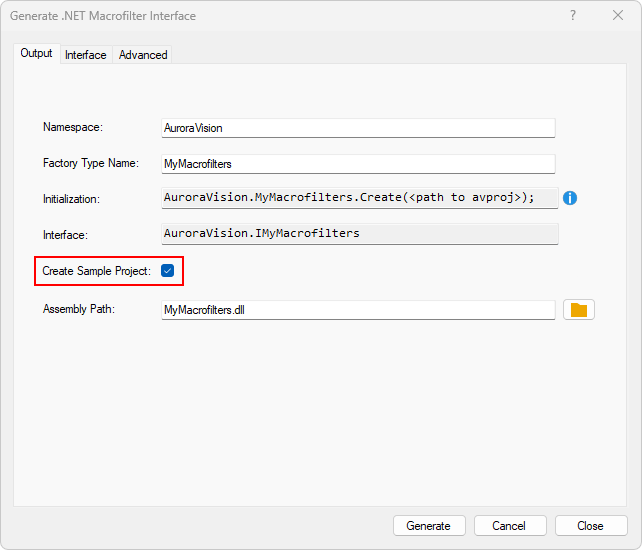 In the Output page of the .NET Macrofilter Interface dialog check the Create Sample Project option to create a default C# project with required configuration properly set for the current Aurora Vision Studio installation.