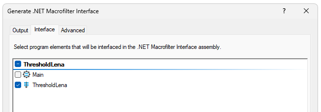 In the Interface page check the ThresholdLena to generate .NET Macrofilter Interface for the macrofilter. This macrofilter will be accessible as C# method later on.