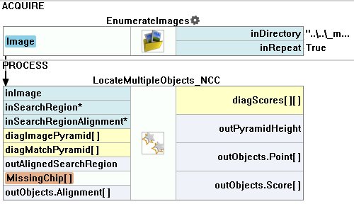 In this problem, a missing element should be treated as a template matching model. Find a missing element using the LocateMultipleObjects_NCC filter.