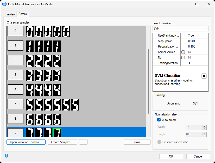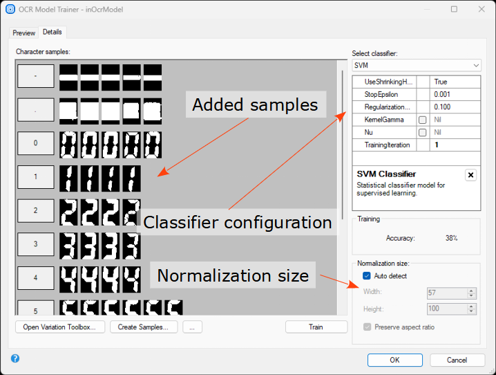 Text recognition editor creates an OCR model for getting text from regions. More details about the traditional OCR technique can be found in Machine Vision Guide: Optical Character Recognition.