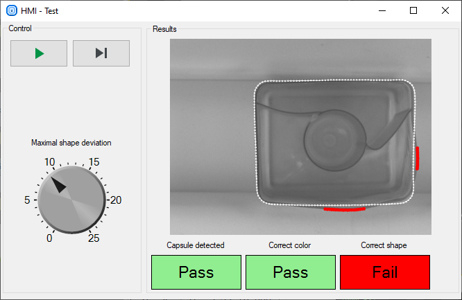 Aurora Vision Executor is a lightweight application that can run programs created with Aurora Vision Studio. The GUI controls that appear in this application are the ones that have been created with the HMI Designer. The end user can manipulate the controls to adjust parameters and can see the results, but he is not able change the project.