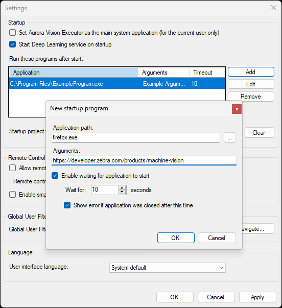 It is possible to run any process before starting a program in Aurora Vision Executor. Go to Settings in Aurora Vision Executor and the Startup section. To define a new startup program select the Add button on the right. In a New startup program dialog box you need to specify the application path (obligatory) and arguments (optional). It is similar to typing the application name and command-line arguments in the Run dialog box of the Windows Start menu. The added program will appear in the list. All added programs will start each time you run Aurora Vision Executor.
