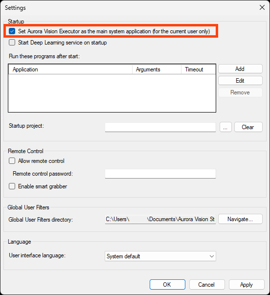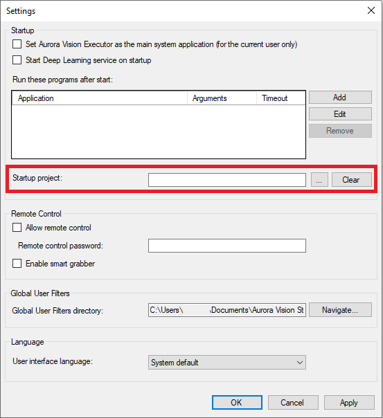 It is possible to choose the project the Aurora Vision Executor should run after the startup. Go to Settings in Aurora Vision Executor and the Startup section. To define the startup project select the ... button on the right. In an Open dialog box you need to specify the startup project path (obligatory). The added project's path will appear in the box. It will start each time you run Aurora Vision Executor.