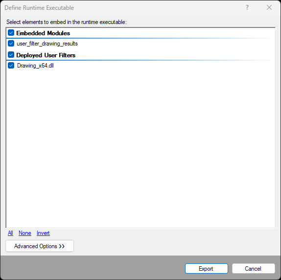 Project ID available in Advanced Options is an additional parameter that makes only a specific license able to run the application. At the customer request, Aurora Vision Team can generate the key (Project ID) and add it to the Runtime license. The same Project ID must be set for Runtime Executable export to connect the application with the specific license. If you leave this field default, any license will be able to run the .avexe file.