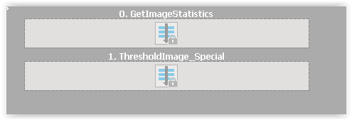 The image below shows a structure of an example program. The macrofilters have been grouped into two Modules. Module FindDefects has macrofilters related to defect detection and a global parameter used by the macrofilters. Notice how the ProcessImage macrofilter is grayed out. It indicates it is a private macrofilter (here it is used by FindShapeDefects). ProcessImage cannot be used outside its module.