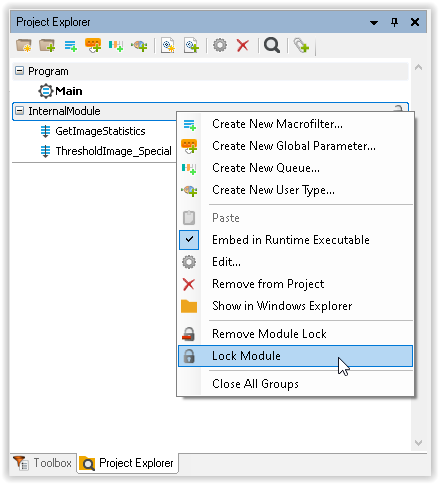 Sometimes users would like to hide the contents of some of their macrofilter to protect them against unauthorized access. They can do this by placing them inside a module and locking it. To do this it is necessary to right click on the module in the Project Explorer and select Lock Module option. User will be then prompted to provide a password for this specific module.