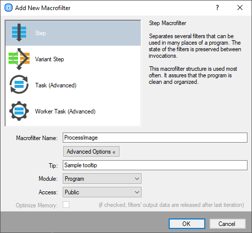 After creating a module you may move already existing macrofilters into the module by dragging them onto the module in Project Explorer. Clicking the Create New Macrofilter... button allows you to create a new macrofilter with the given name. During that you can access Advanced options by clicking the appropriate button. There you can specify the parent module and access to the macrofilter. Access can be either private or public. Private macrofilters cannot be directly used outside its module. You can also provide a tooltip (description) for the macrofilter. This will show up in the properties section of an instance and when hovered over in the Project Explorer. Tooltip should describe the macrofilter's purpose and be concise. They are especially important when creating an
