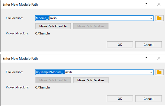 To create a module, click the Create New module... button and then a dialog box will appear. In there you specify the location and name of the module. The path may be absolute or relative. Modules are saved with extension .avlib. Saving and updating the module files happens when the containing program is saved.