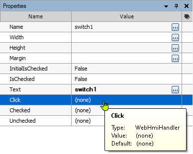 - Left-click the WebHMI control that will be the source of an event and look up its properties. To find which controls have defined events, refer to the Standard WebHMI Controls entry.