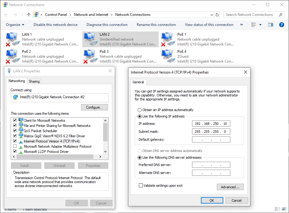 Change address of the network card of 4Sight EV6 computer (LAN 2 port) connected to the switch to 192.168.250.10 as shown below: