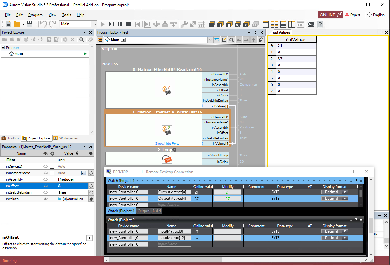 Once communication between PLC and 4Sight EV6 is established, you can create program in Aurora Vision Studio. Add watch tables to easily modify data in Sysmac Studio: