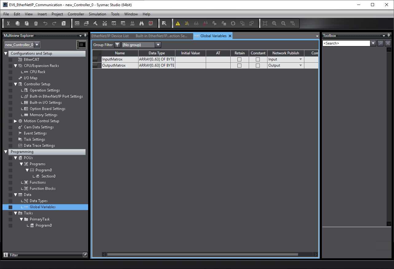 Below you will find an example configuration process for EtherNet/IP PLC Omron NX1P2-9024DT in Sysmac Studio software.
