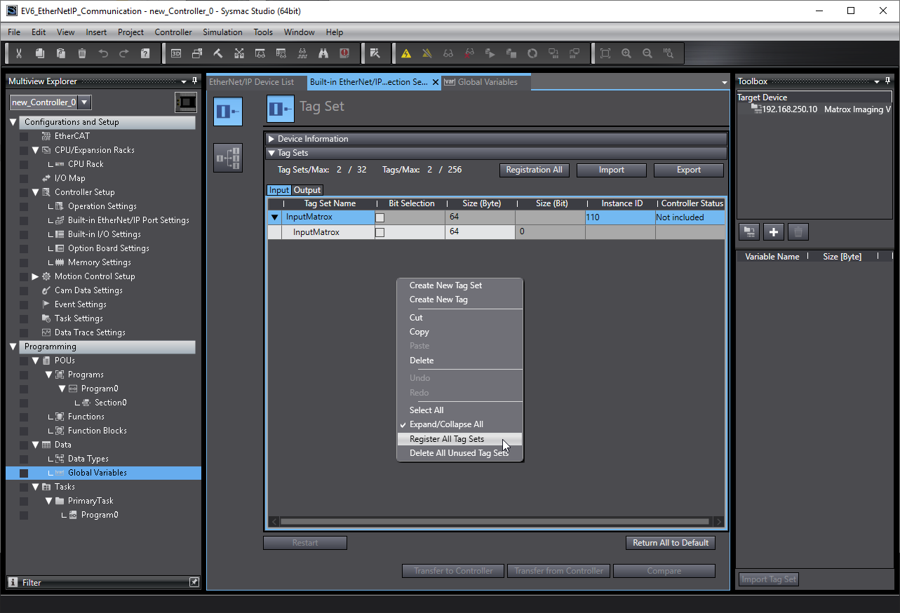 Then navigate to (Tools -> EtherNet/IP Connection Setting) and "Register All Tag Sets".