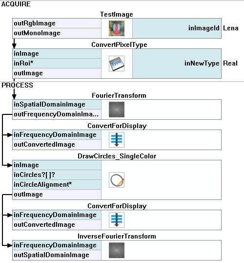 2. Add the ConvertPixelType filter and set the inNewType as Real to prepare data for the Fourier transform. Connect its inImage input with the outMonoImage output.