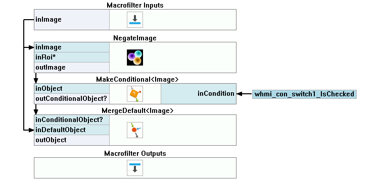 - In DisplayNegatedImage macrofilter, connect MakeConditional::Image filter input inCondition to switch1 control outIsChecked output;