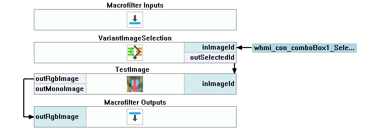 - In GetComboBoxImage macrofilter, connect VariantImageSelection filter input inImageId to comboBox1 control outSelectedIdentifier output;