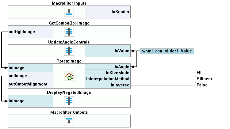 - In SliderRotateImage event handler, connect UpdateAngleControls filter input inValue and RotateImage filter input inAngle to slider1 control outValue output.