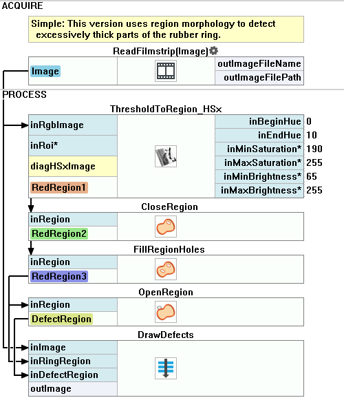 - Add the ThresholdToRegion_HSx and connect the ReadFilmstrip output with the inRgbImage.