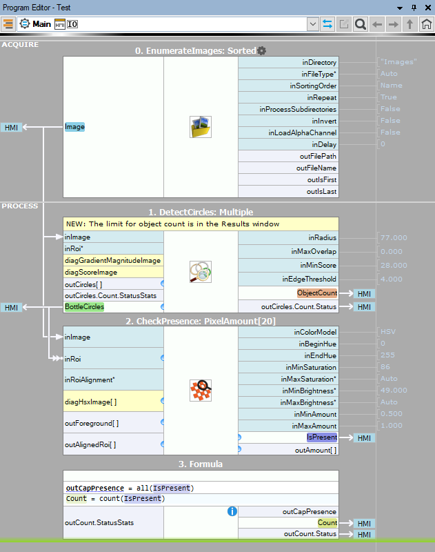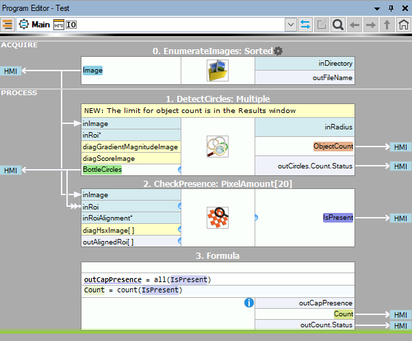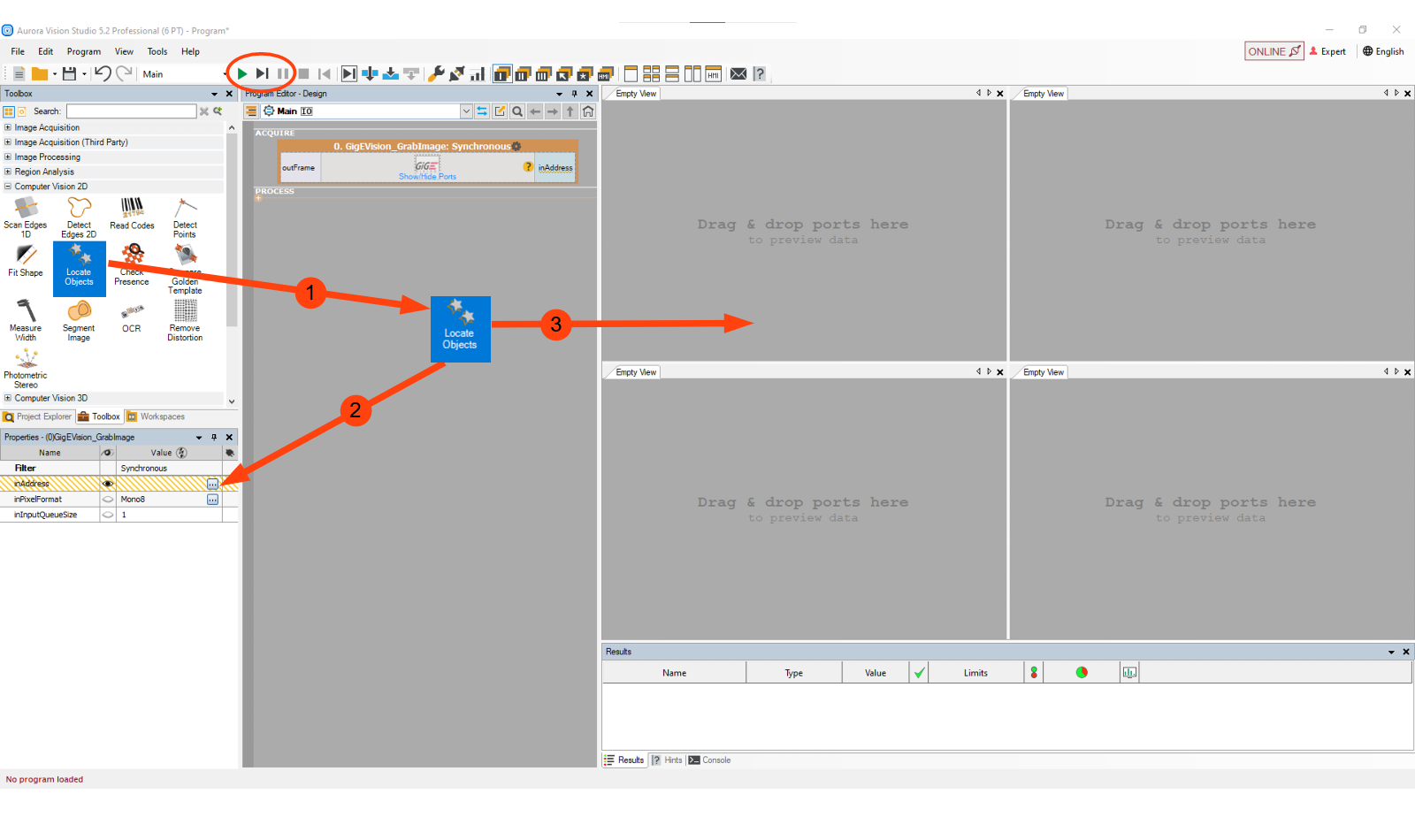 The Program Editor is the area within Aurora Vision Studio in which filters (tools) are placed and connected to create programs. To insert a filter there, just drag and drop one from the Toolbox or double-click on it.