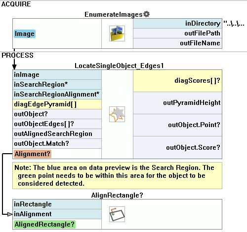 Add the LocateSingleObject_Edges1 filter to the PROCESS section and connect it with the output image.