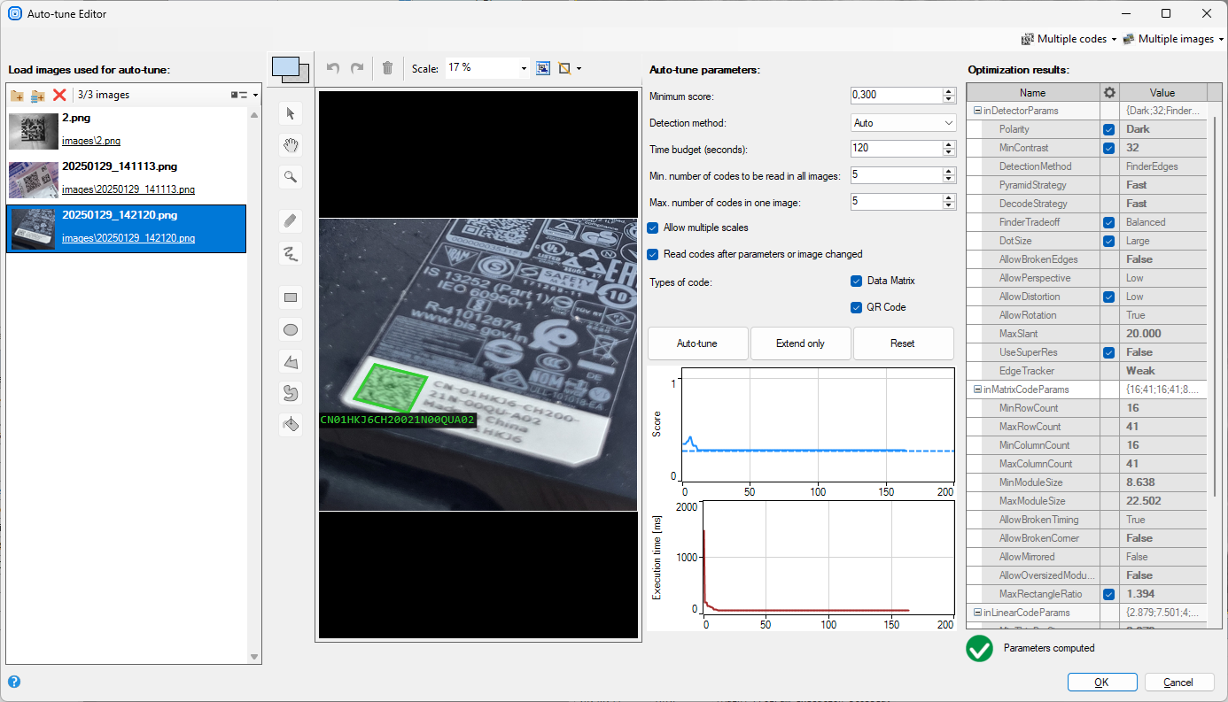 After pressing the Auto-tune button, the optimization process begins. The algorithm initially attempts to read as many codes as possible (at least the minimum defined number). Then, the parameters are refined to improve the scores of the read codes until at least the minimum defined score is achieved. Finally, the parameters are optimized to achieve the smallest possible execution time while still reading the required number of codes and maintaining an acceptable score.