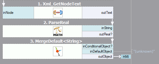 MergeDefault filter can be used to replace a numeric display in HMI with a label indicating a reading error, such as "(unknown)" or "N/A". Here, we are reading some value from an XML node. If it cannot be parsed (e.g. because there is incorrect syntax), then a special text will be displayed instead.