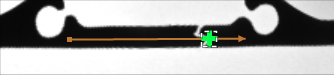ImageAlongArc performed on the sample image with inAxisType = X and inScanWidth = 50. Point marked with green cross on the output image was calculated by ScanSingleEdge. Original point (marked with blue cross) was calculated using PointAlongArc with inAxisType = X, inAxisCoordinate = 25, inInverse = true and position of detected point. ImageAlongArc and PointAlongArc used the same arc for transformations.