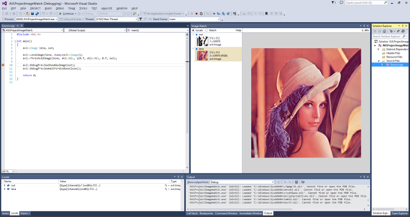 For Microsoft Visual Studio 2015, 2017 and 2019 an extension Image Watch is available. Image Watch allows to display images during debugging sessions in window similar to "Locals" or "Watch". To make Image Watch work correctly with avl::Image type, Aurora Vision Library Lite installer provides avl::Image visualizer for Image Watch. If one have Image Watch extension and AVL installed, preview of images can be enabled by choosing "View->Other Windows->Image Watch" from Microsoft Visual Studio menu.