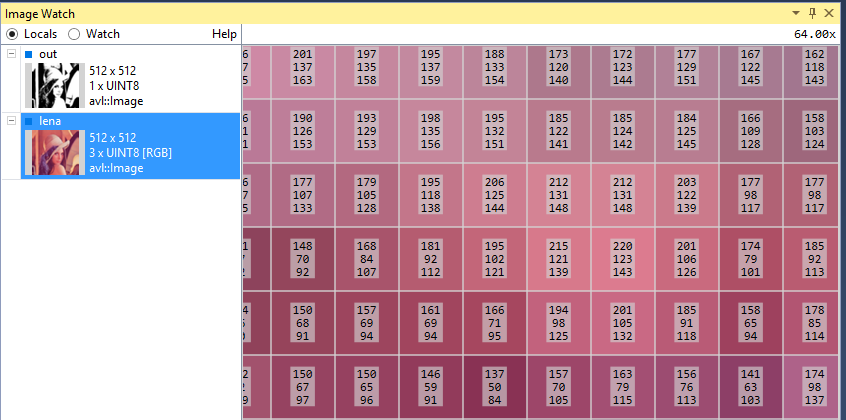Image displayed inside Image Watch can be zoomed. When the close-up is large enough, decimal values of pixels' channel will be displayed. Hexadecimal values can be displayed instead, if appropriate option from context menu is selected.