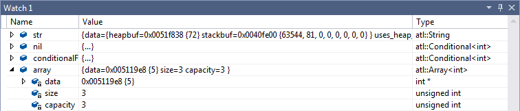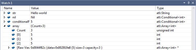 atl::String str = L"Hello world"; atl::Conditional<int> nil = atl::NIL; atl::Conditional<int> conditionalFive = 5; atl::Array<int> array(3, 5);