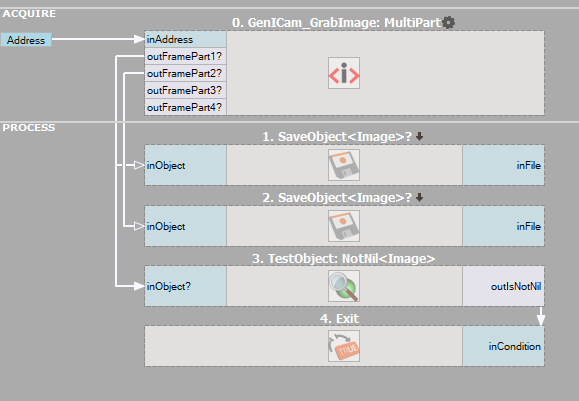 A simple program that stops when the full image form the camera is acquired is presented on the first image below. The second image is the program that loads the acquired objects, resizes them properly and allows further analysis of the image.