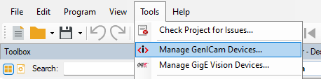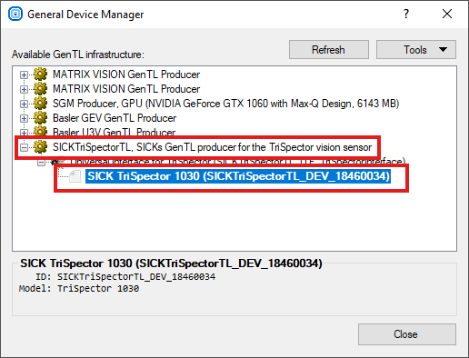 After all the previous steps restart or turn on Aurora Vision Studio. Check if TriSpector is connected in the GenICam Device Manager: