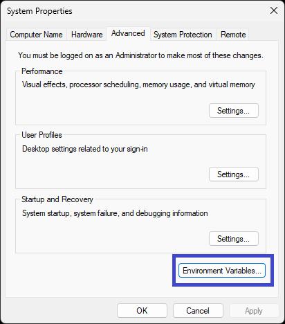 In Advanced System Settings, in the Advanced tab press Environmental Variables.