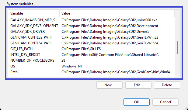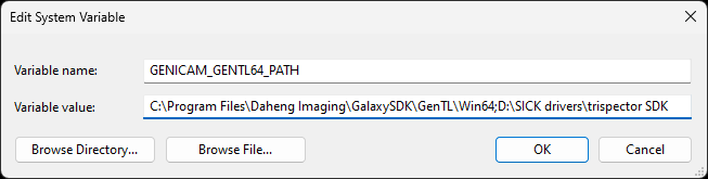 - Check if variables GENICAM_GENTL64_PATH and GENICAM_GENTL32_PATH exist. To do it browse the selected window: