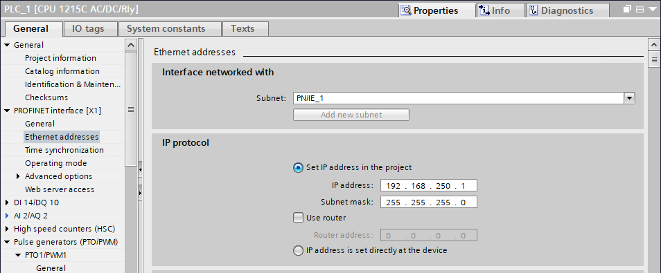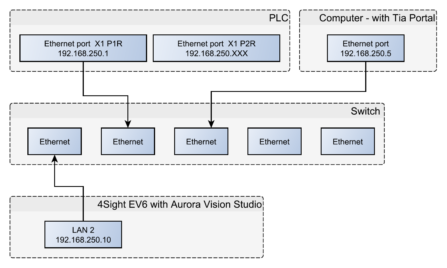 In application notes there is configured one network which uses Ethernet switch. Devices connected to this network have addresses 192.168.250.XXX, where XXX stands for number 1-254 unique for every device/port connected.