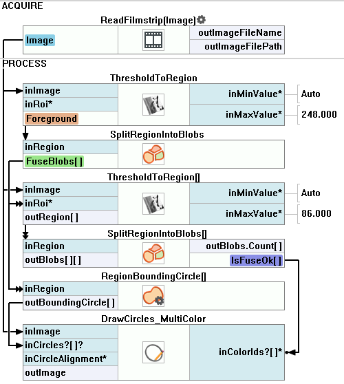 - Connect its inputs: the inCircles with the outBoundingCircle and the inColorIds with output IsFuseOK of the second SplitRegionIntoBlobs filter.